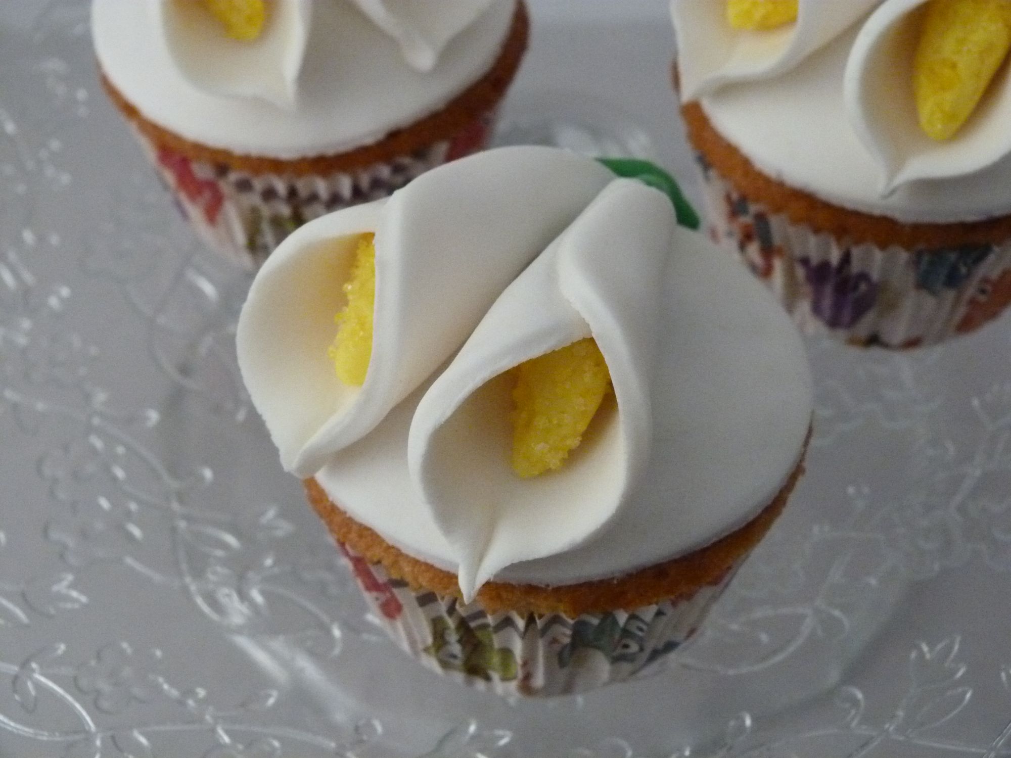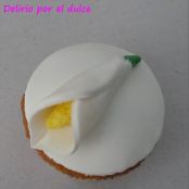 Una vez terminadas las calas pegarlas con pegamento comestible sobre la base blanca de fondant del cupcake.