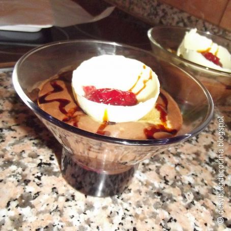 Ya tenemos preparada nuestra mousse de chocolate. Ahora nos buscamos un molde chulo, para crear nuestro postre donde quepa todo(como se ve en la foto yo he usado uno tipo bol). Untamos la base de este recipiente con un poco de mermelada de fresas (Hero sin azúcar), después añadimos la mousse de chocolate encima.