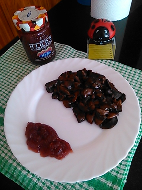 En una sartén con una cucharada de aceite de oliva virgen extra sofreímos ajo y perejil,para seguidamente saltear los champiñones.Añadimos una pizca de sal y pimienta al salteado y lo retiramos del fuego.Emplatamos y lo servimos con un toque de Mermelada de Higos Hero de Temporada,¡está para chuparse los dedos! ;)