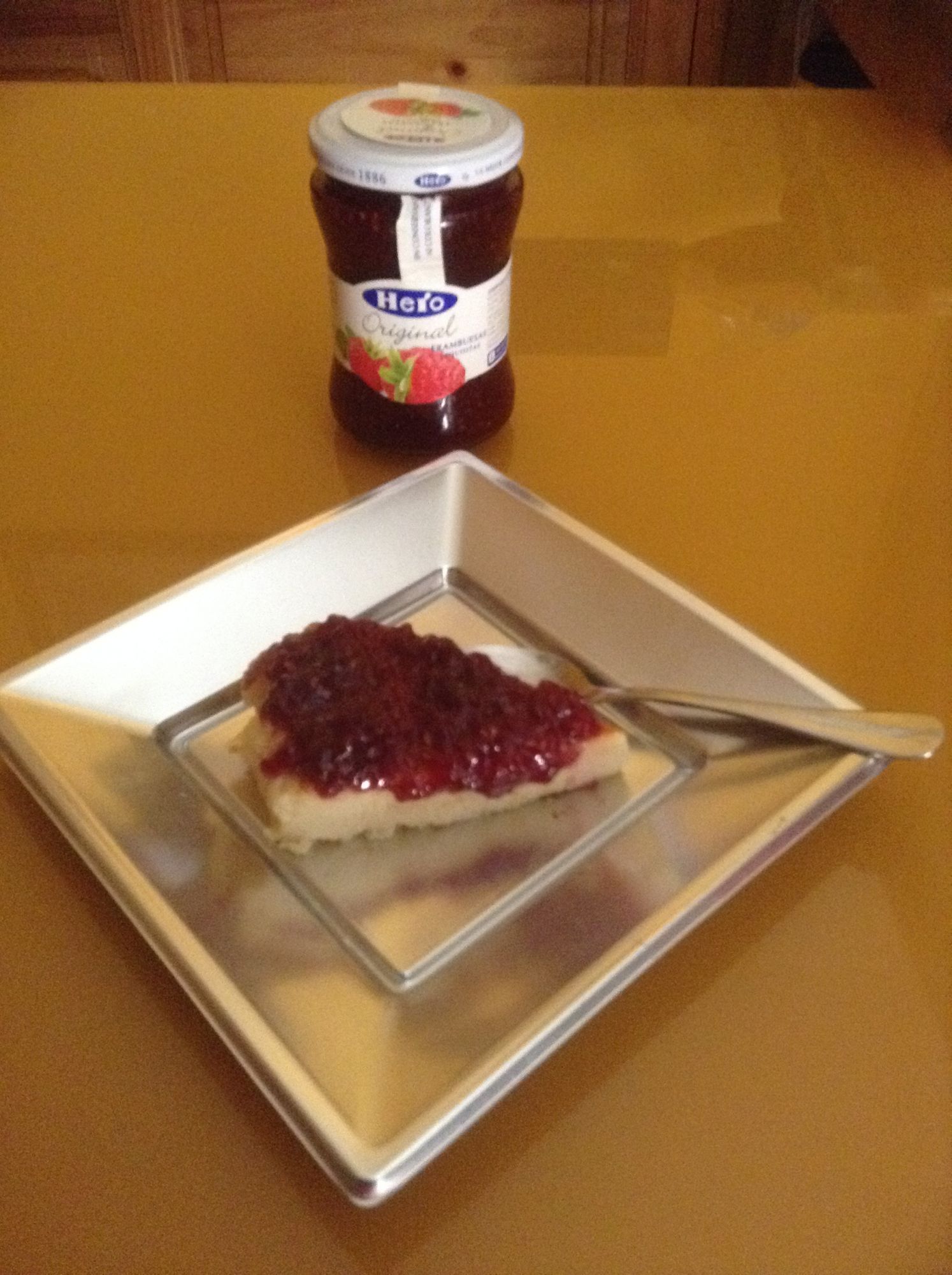 Ya frío, se desmolda y se adorna con una boina de mermelada de frambuesa.