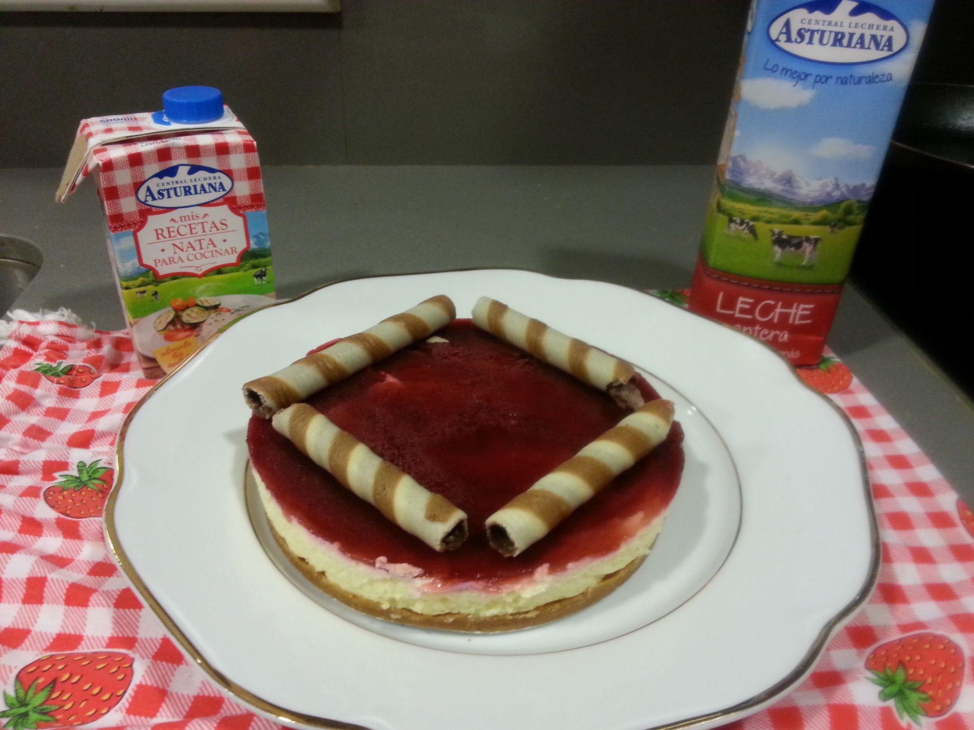 sacamos de la nevera y ponemos una capa encima de mermelada de fresa bien repartida, metemos en el congelador durante al menos 6 horas
