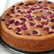 Verter la masa en el molde, distribuir las frambuesas por encima presionando ligeramente para que adhieran a la masa.