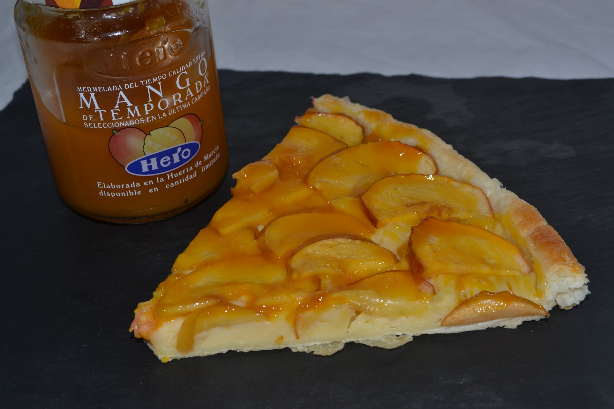 Manzanas asadas sobre una base de crema pastelera y hojaldre, aderezada con mermelada de temporada de mango Hero.