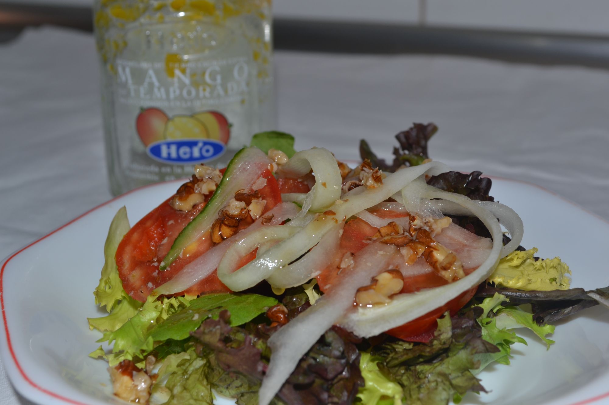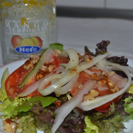Montaje: en un plato poner 3 buenos trozos de pollo salseando con el escabeche, añadir mezclum de lechugas cubriendo el pollo a modo de sorpresa, poner alrededor el tomate, los espagueti de pepino y aliñar con la vinagreta de nueces.