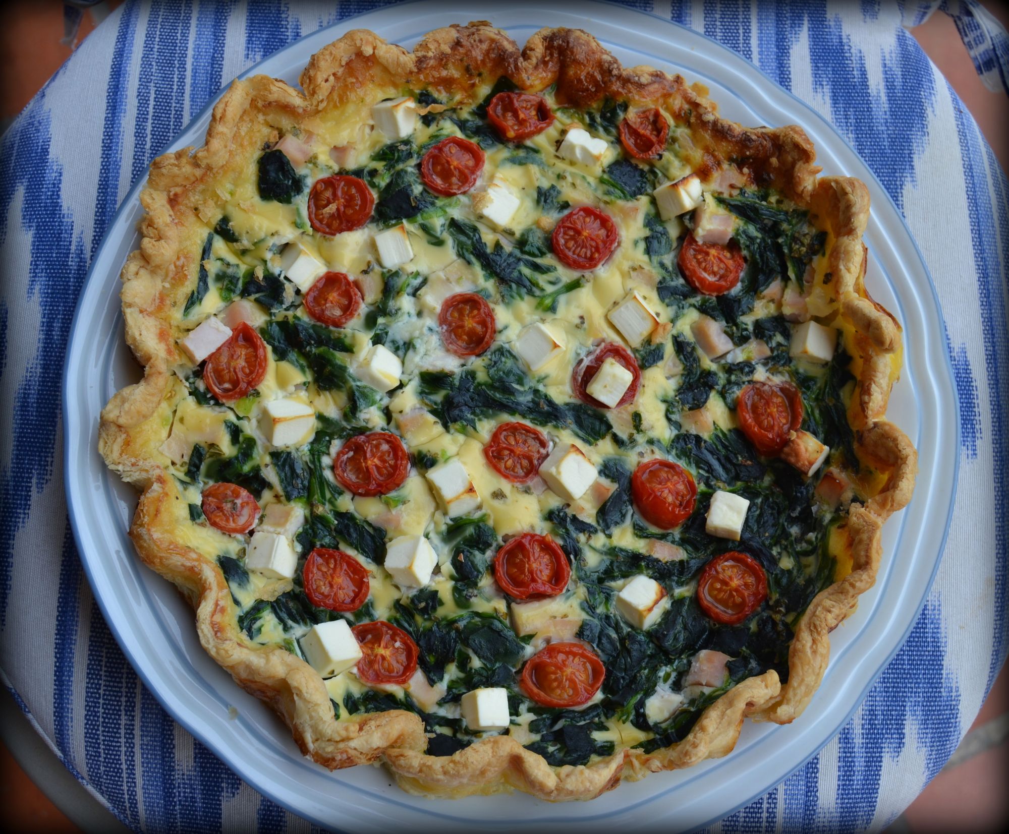 Cortar los tomates por la mitad y repartir por toda la quiche. Repartir también el queso feta de manera que quede bien distribuido por todo.