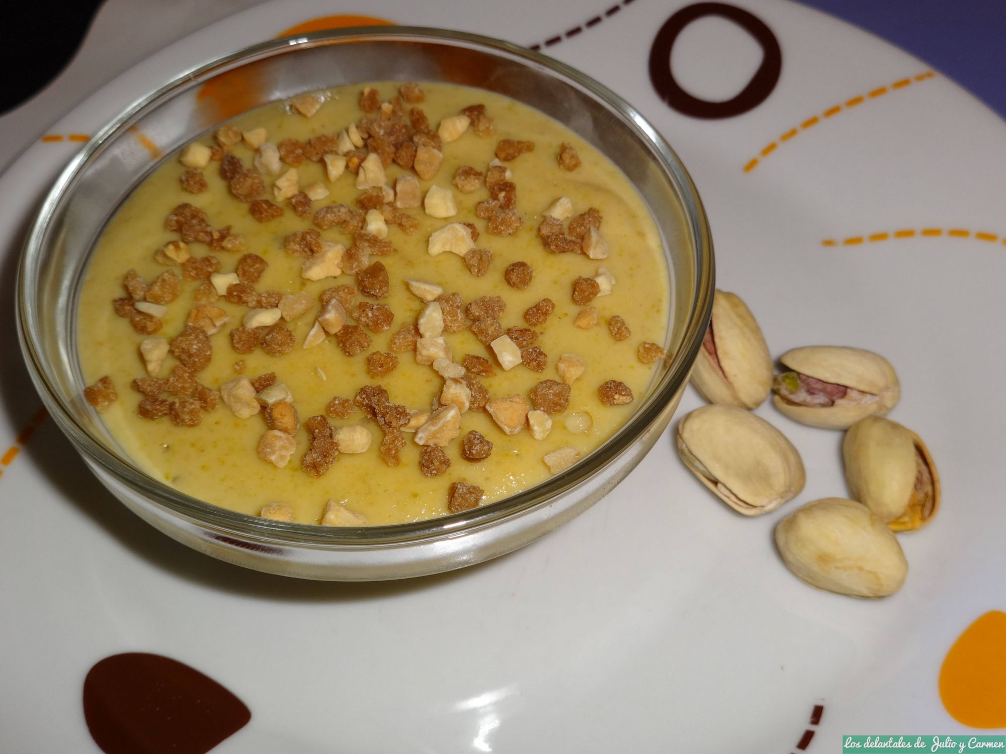 Echamos los pistachos y con la batidora, los trituraremos. Volvemos a llevar al fuego cuando tengamos todo bien batido y removiendo lo tendremos unos minutos, pero sin que llegue a hervir.