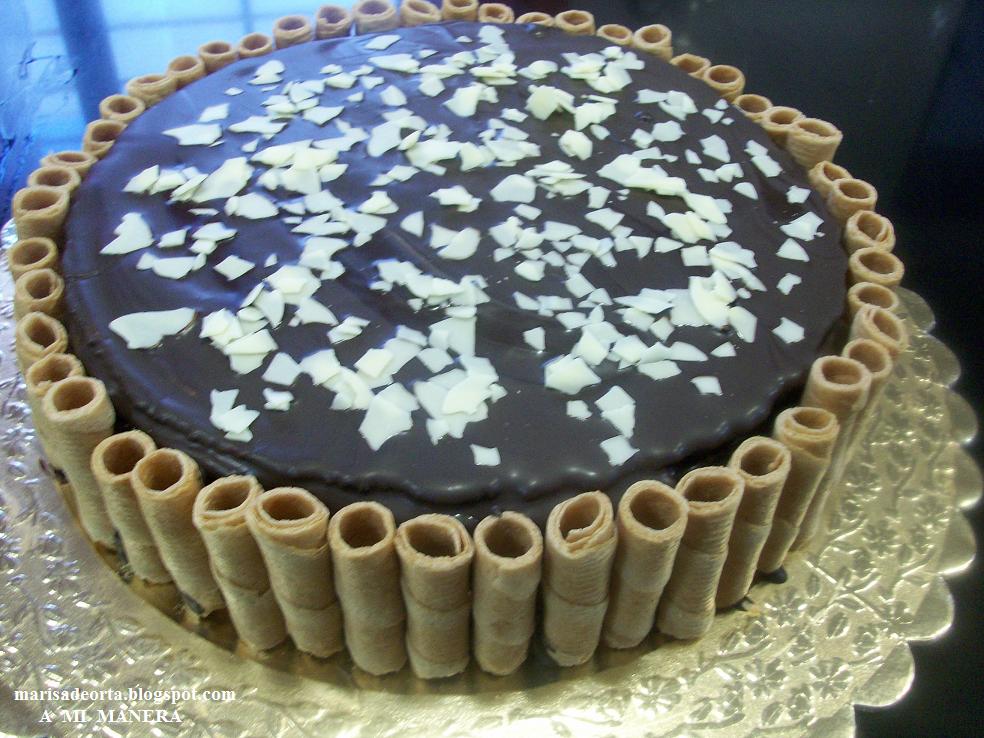 - Echar un poco de chocolate fundido en los barquillos y pegarlos por todo el diámetro de la tarta, echar por encima las virutas de chocolate blanco y lista para disfrutar.