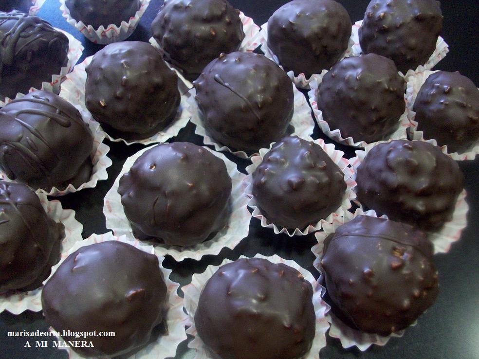 - Derretir el chocolate de cobertura y bañar los bombones, ponerlos a secar sobre papel vegetal y cuando estén secos colocarlos en papelillos de trufas.