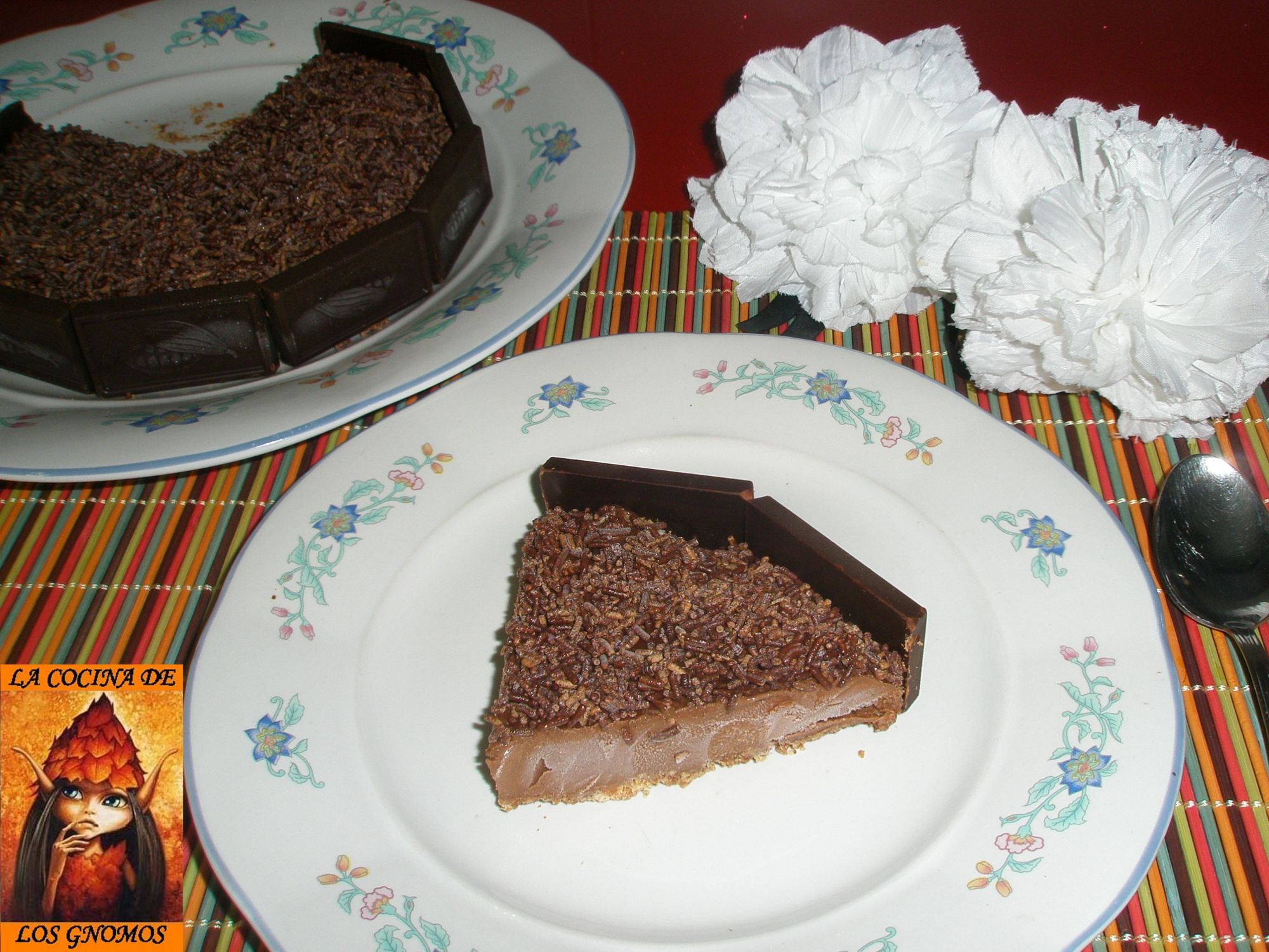 A la hora de servir, ponemos en una bandeja, retiramos el molde y el papel sulfurizado y decoramos como mas nos guste; yo lo he hecho con chocolatinas y fideos de chocolate.