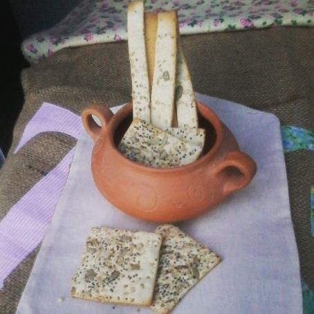 Estirar la masa con palo hasta que quede finita ( 2 mm de espesor). Espolvorear semillas sobre la masa y volver a pasar palo de amasar para que se adhieran. Cortar en cuadrados o palitos tipo sticks y hornear por 10 min en horno caliente hasta dorar.