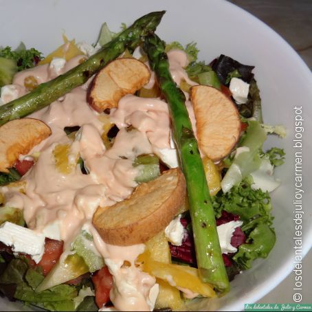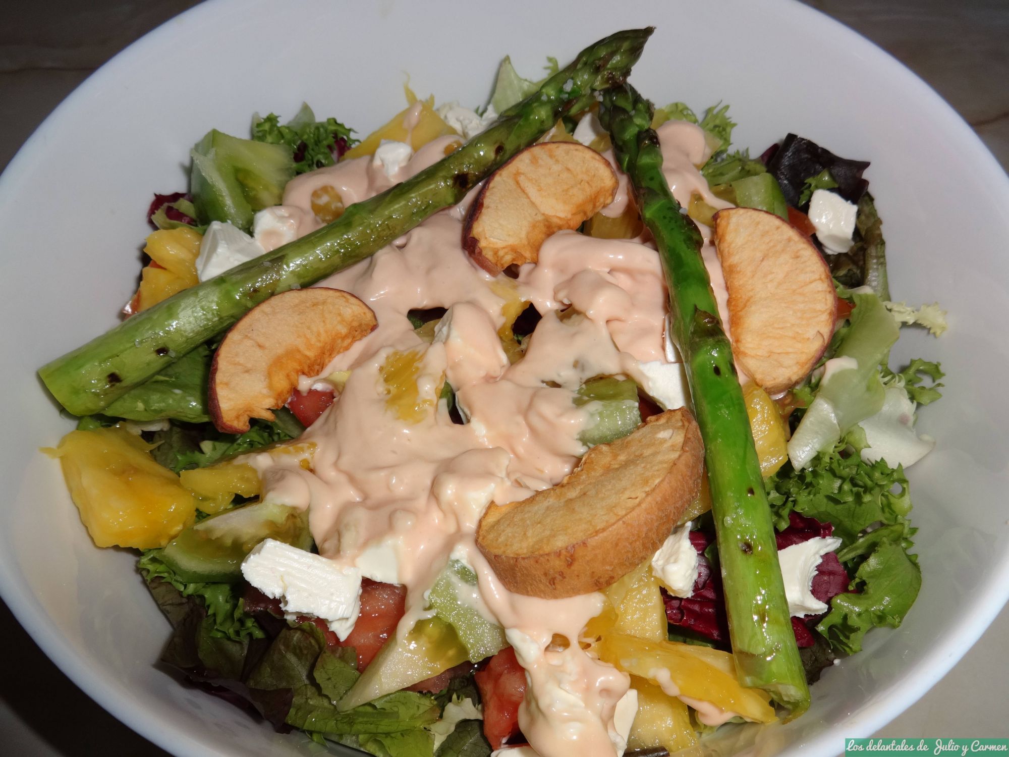 Verteremos sobre la ensalada ya lista la salsa rosa que teníamos y colocaremos encima los espárragos recién preparados y los chips crujientes de manzana.