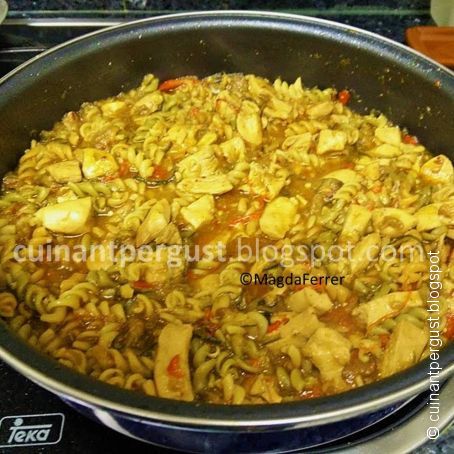 Añadir la pasta, remover y a continuación echar el caldo. Subir un poco el fuego y dejar cocer tapado, removiendo de vez en cuando con cuidado que no se pegue, hasta que el caldo casi se haya evaporado y la pasta esté tierna.