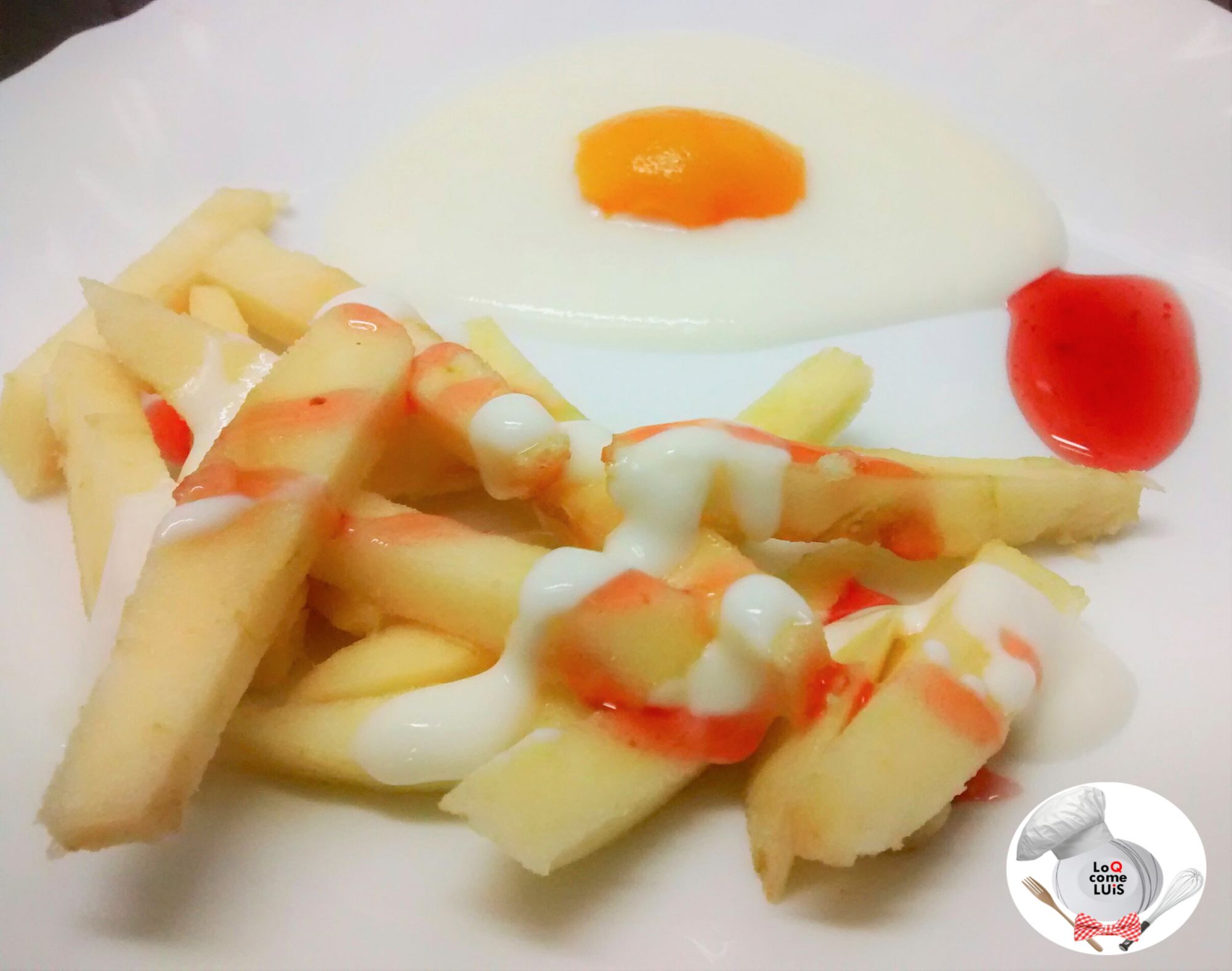Por último utilizar el sirope de fresa para echarlo por encima de la manzana o en algún lado del plato, de manera que parezca ketchup o una salsa de tomate.