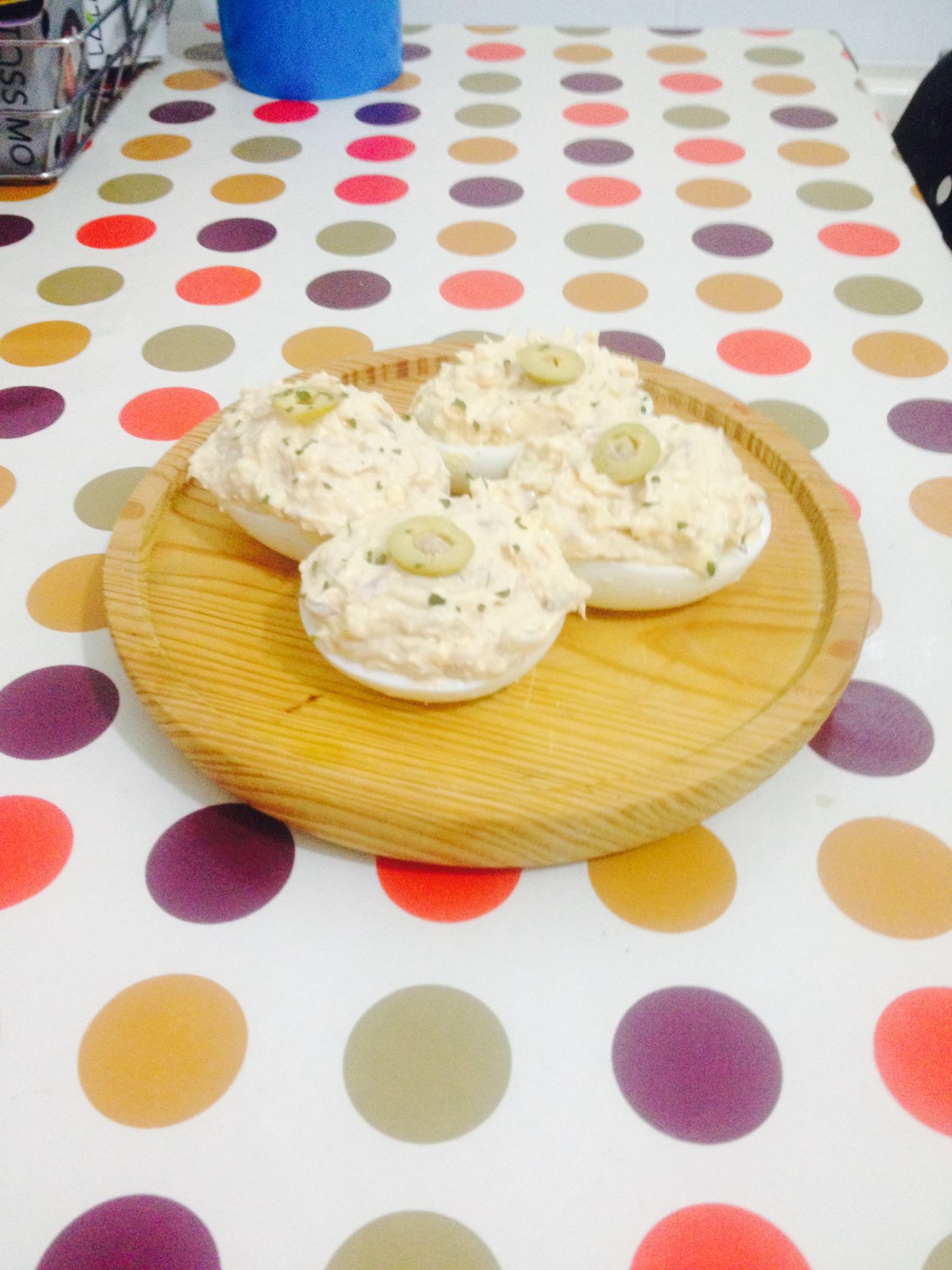 Ir rellenando con una cucharilla, cortar las aceitunas para decorar, también se puede apartar una yema y rallarla por encima