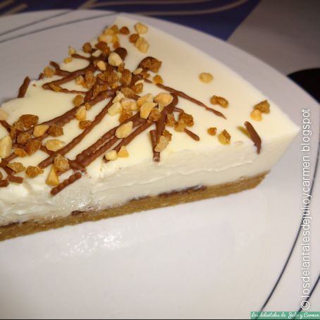 Cuando comprobemos que a cuajado, continuamos con la decoración. Derretimos el chocolate con leche, y volvemos a verterlo sobre la tarta, de la forma que mas nos guste. Volvemos a dejarla en la nevera para que el chocolate endurezca.