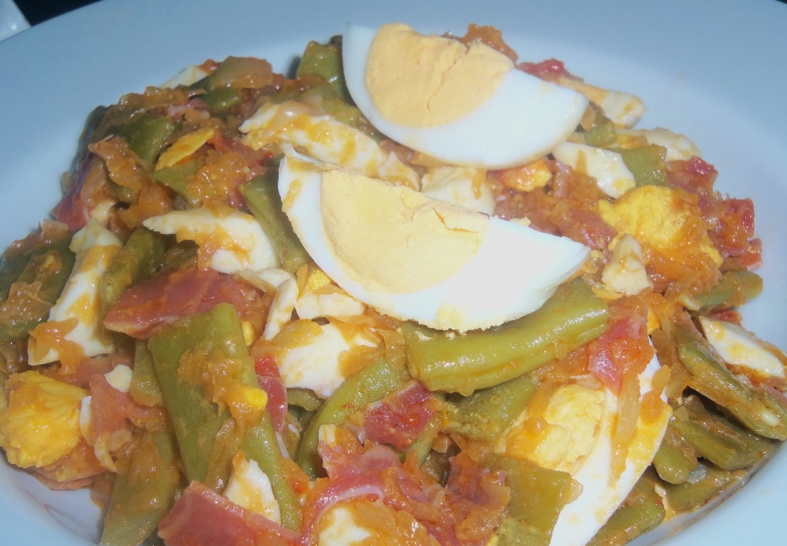 6/ En crudo sin ponerlo al fuego añadimos los fréjoles, las tiras de jamón y lo mezclamos. Incluimos los huevos previamente troceados dejando tres para decorar, un poco de tomate frito, lo revolvemos y lo vamos aplanando todo con la ayuda de la cuchara de madera.