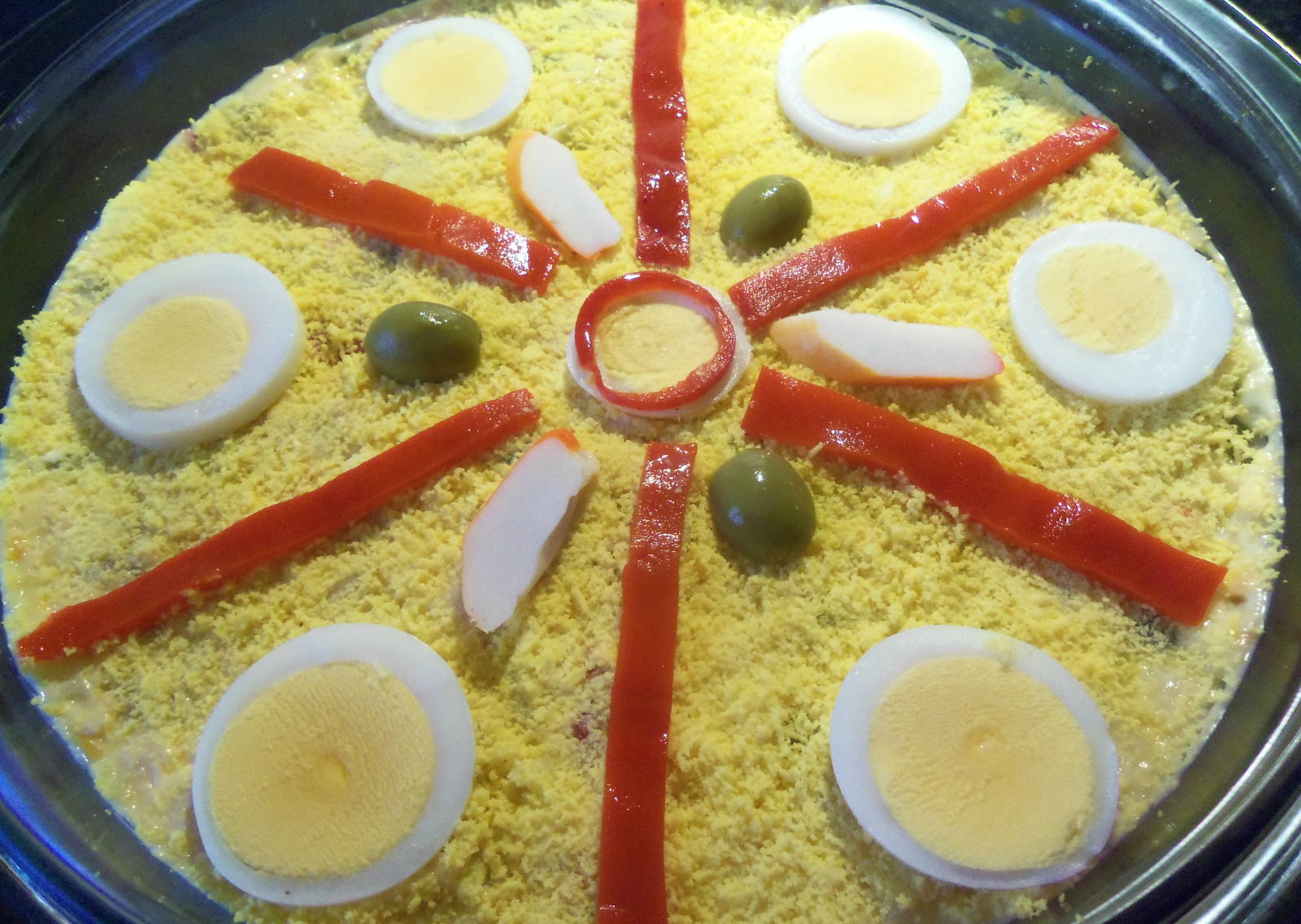 Finalmente por encima de ella se le añade un pimiento en tiras alargadas, unas aceitunas y unos trozos de palitos de cangrejo para decorar.