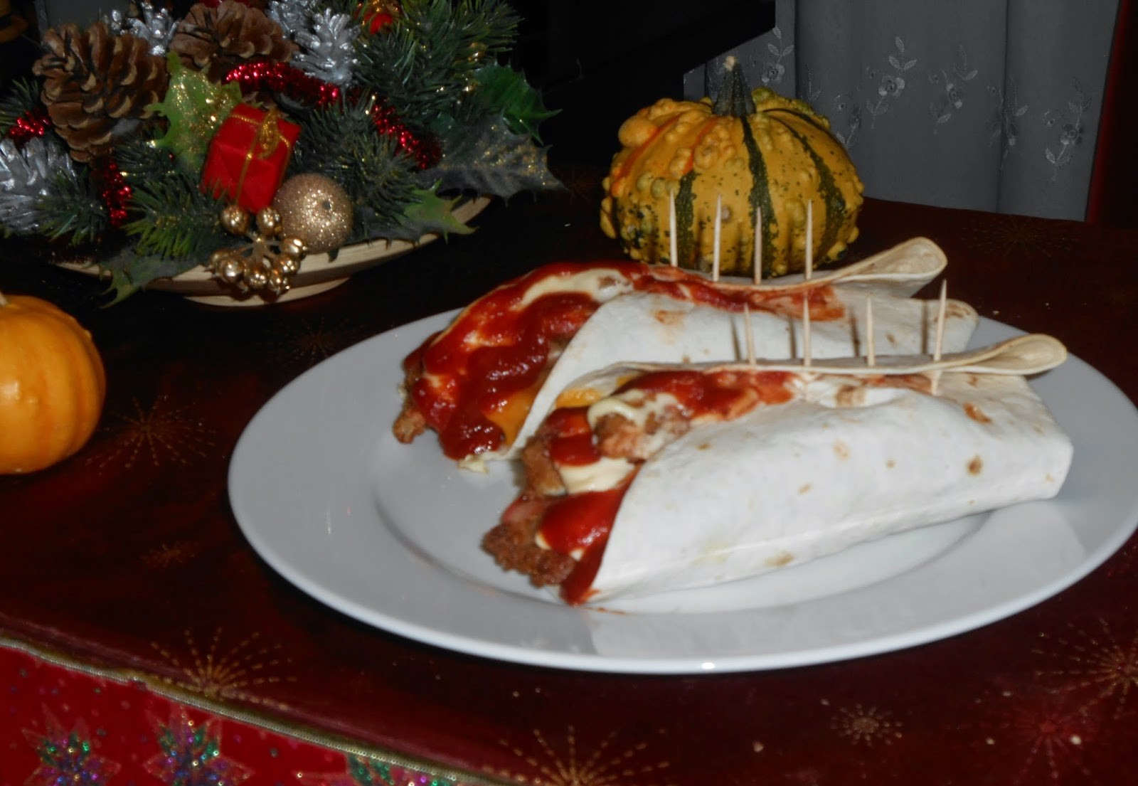 5/ Cerramos el wraps realizando una doblez en la parte de abajo hacia arriba y luego plegamos los dos costados de los lados uno sobre otro, procurando que queden bien apretados. Clavamos 2 palillos grandes para que se mantenga cerrado el wraps ó 4 de los pequeños.