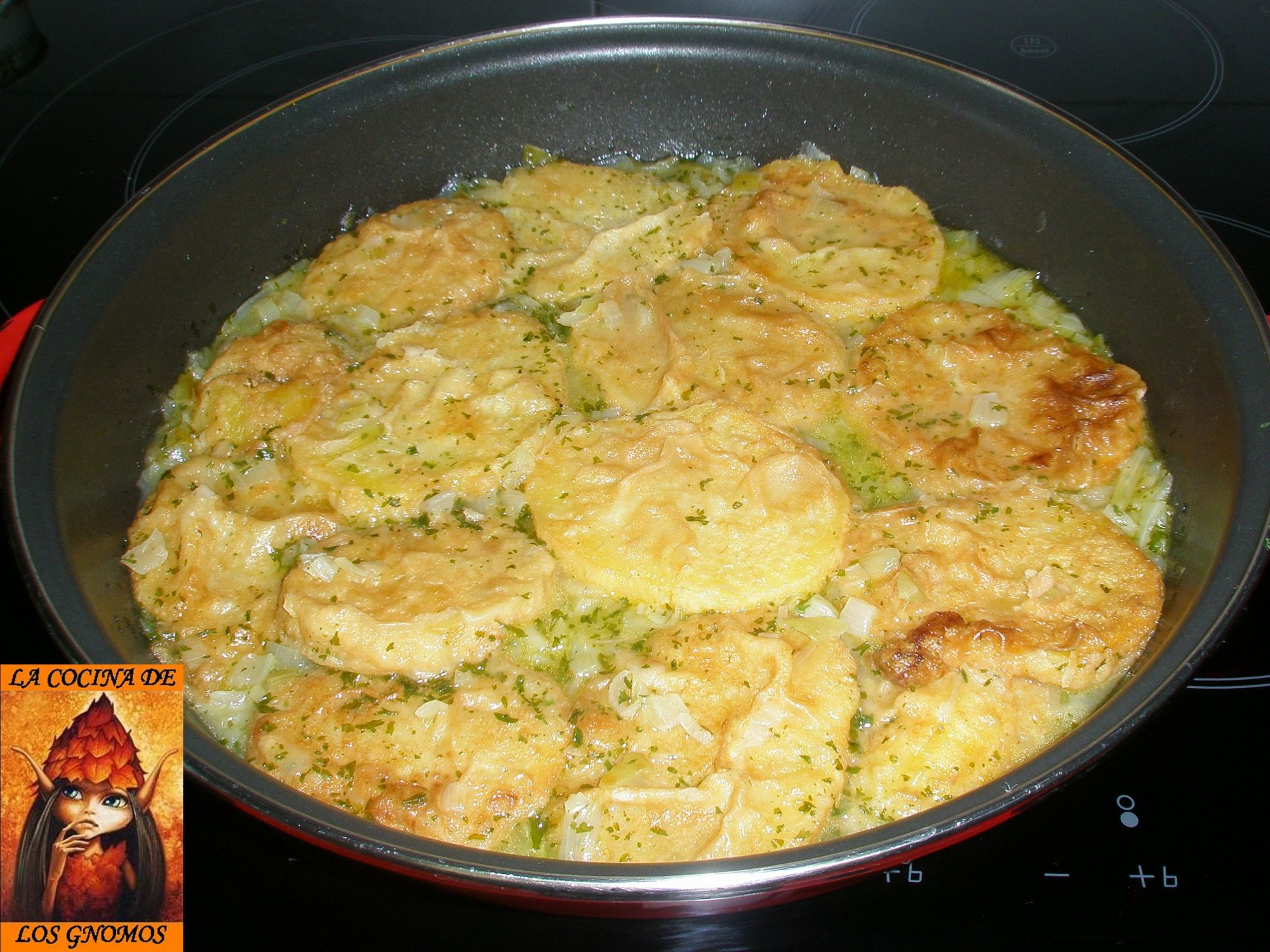 En una paellera, ponemos la cebolla pochada, las patatas y cubrimos con el caldo caliente. Dejamos cocer durante 15 minutos o hasta que la patata esté tierna. Cuando queden un par de minutos para terminar el guiso, espolvoreamos con perejil picado y servimos inmediatamente.
