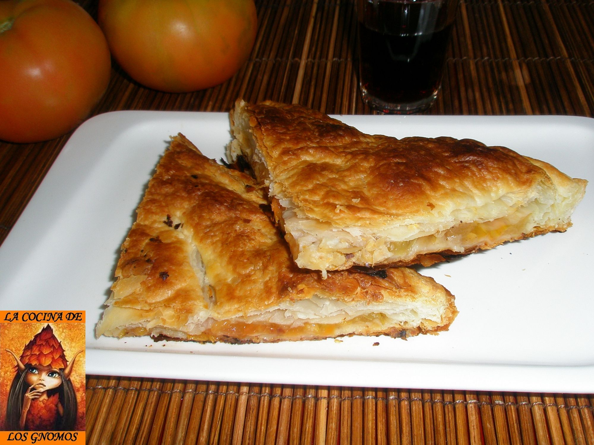 3- Cuando ya estén hechos los tomates, extendemos en la fuente del horno la masa de hojaldre sobre un papel sulfurizado y la cortamos por la mitad. En una mitad ponemos los tomates fritos, tapamos con la otra mitad, sellamos los bordes y hacemos unas incisiones encima para que salga el vapor. Pincelamos con agua o huevo batido para que salga dorada.