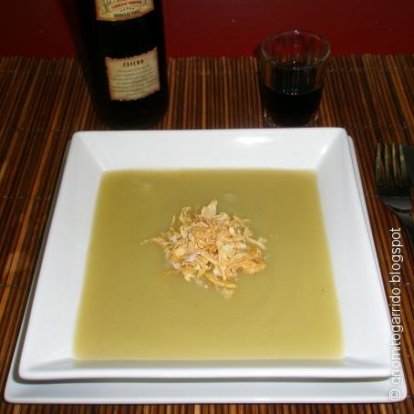 4- Podemos servir la crema fría o caliente acompañada de unos costrones de pan, huevo duro picado, o como en mi caso, con unos chips de cebolla deshidratada.