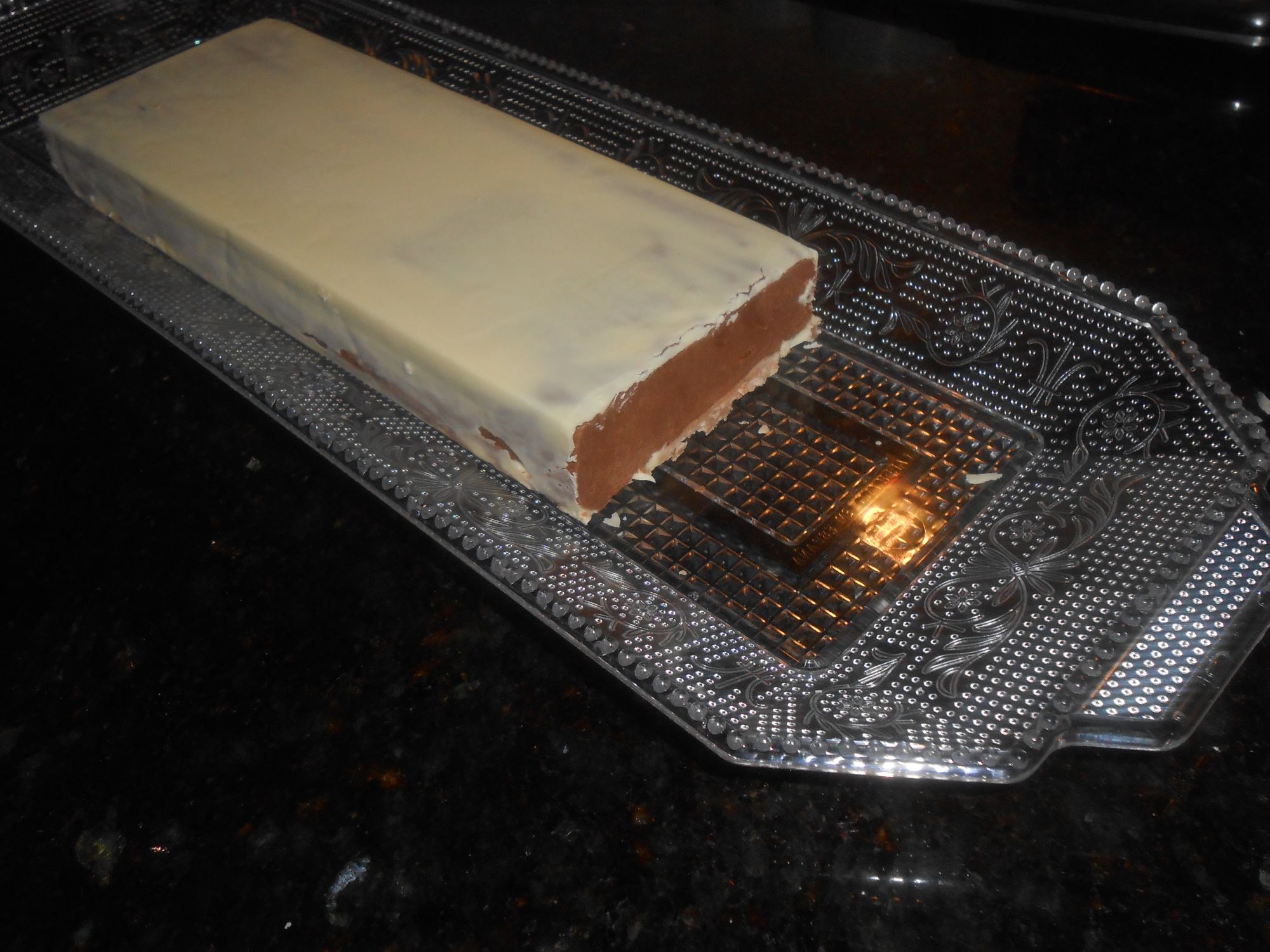 Una vez que endurezca abrimos el papel vegetal que pusimos anteriormente por encima y en un cazo derretimos la otra 1/2 tableta de chocolate blanco que nos había quedado al baño maría y lo echamos por encima repartiéndolo , lo tapamos de nuevo con el papel vegetal y lo dejamos que esté compacto a temperatura ambiente.