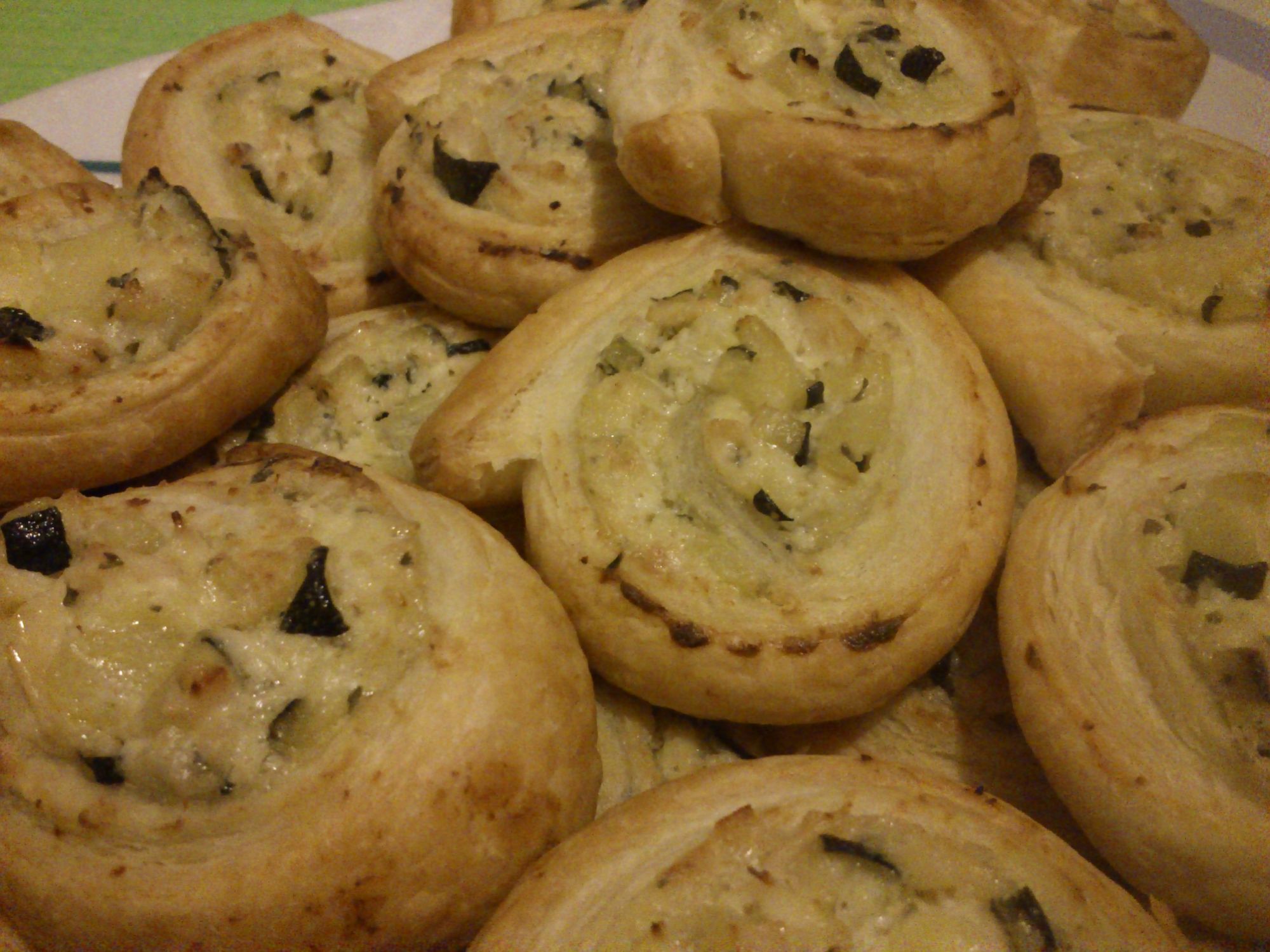 Estiramos nuestra masa de hojaldre y la rellenamos hasta 3/4 con los puerros casi frios (para que no se ablande mucho la masa) y enrollamos como un brazo gitano. Cortamos rodajas de 1cm y las vamos poniendo en la placa del horno, las pintamos con el huevo batido.