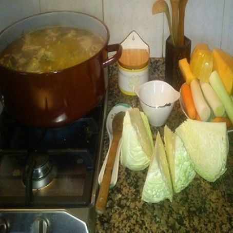 Pasada la hora de cocción, vamos añadiendo la verdura empezando por la que màs cuestan, las zanahorias, chirivías, calabaza, puerros, nabos, patata y calabacín, rectificamos la sazón y dejamos cocer hastá que la verdura esté hecha.