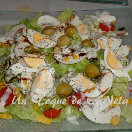 Poner en la fuente de servir, la lechuga, los Cherry cortados transversal, el maíz cortado y desgranado, los huevos duros cortados, pellizcos de mozzarella y las aceitunas.