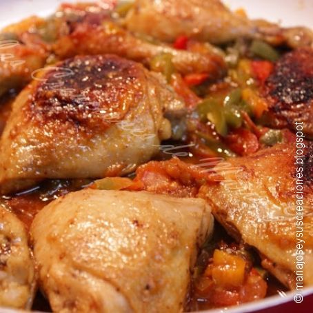 Cortar los muslos a la mitad, salpimentar y dorarlos con el aceite en una cazuela hasta que estén dorados, sacarlos y reservarlos. Limpiar y trocear los pimientos y el tomate. Freír 10 minutos en la cazuela. Incorporar el pollo, tapar y hacer a fuego suave 45 ó 50 minutos. Rectificar de sal, añadir la almendra molida y dar unos hervores tapado o destapado según el exceso de salsa. Se puede acompañar con lo que queráis (patatas, arroz, cuscus, etc.)
