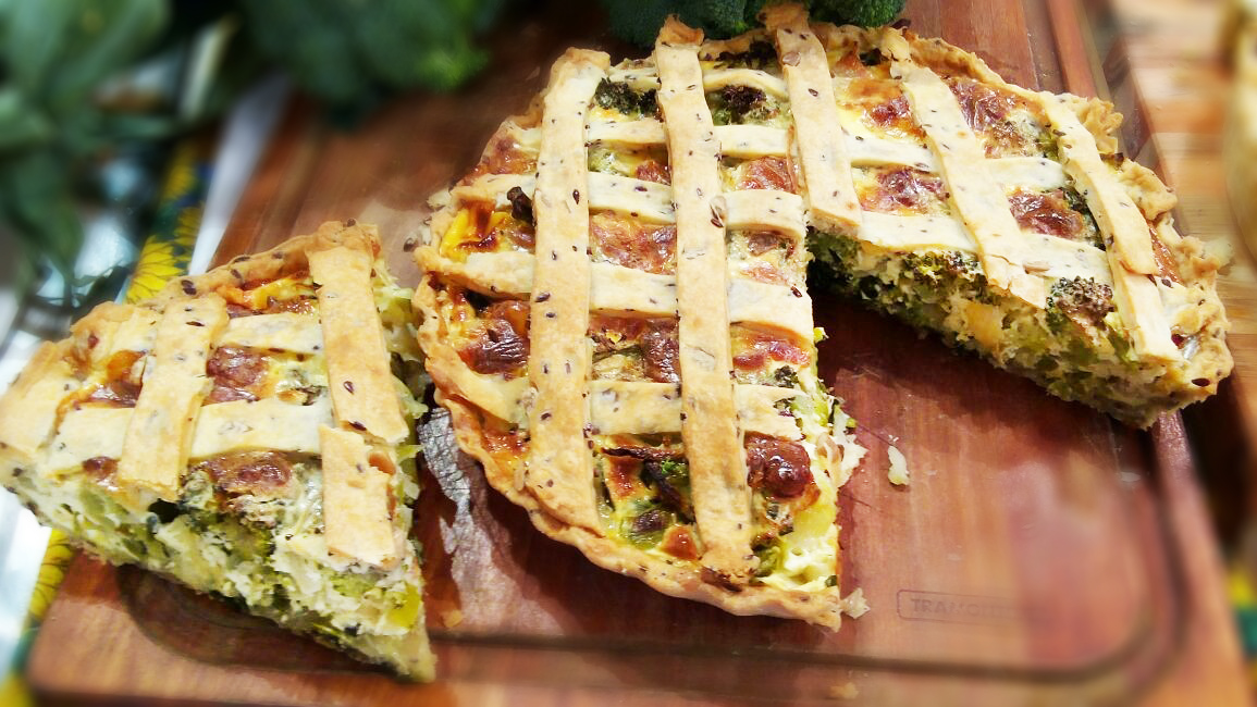 Para el ligue, batir los huevos con el queso rallado y el queso crema. Luego verter los vegetales en la tarta e incorporar el ligue. Decorar la tarta con las tiritas de masa sobrantes.