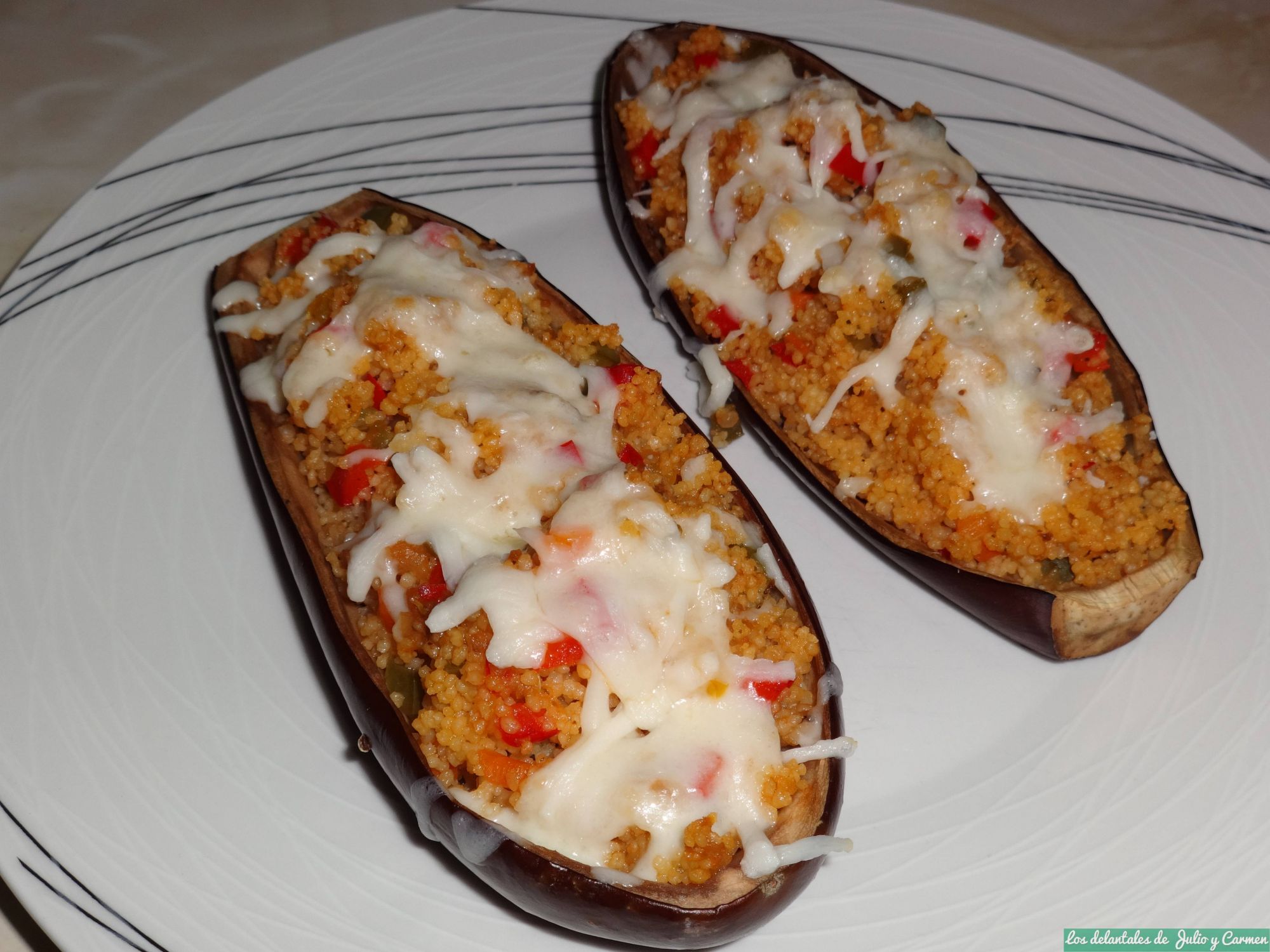 Mezclamos las verduras con el cuscús y vamos rellenando las mitades de las berenjenas con la mezcla.
