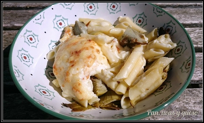 Troceamos las alcachofas y las mezclamos con la pasta. Echamos los macarrones en una fuente apta para el horno.