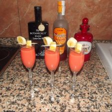En una cocktelera mezclamos el vodka con el zumo de frutas, cerramos y agitamos hasta obtener un poco de espuma.