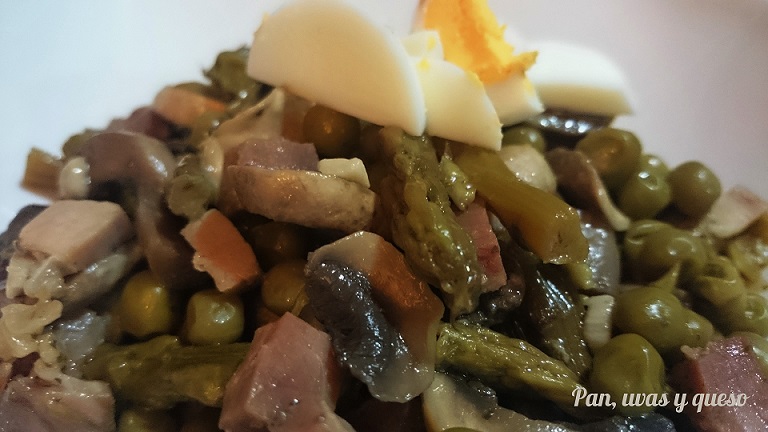 Lavamos y troceamos los champiñones. Cortamos el jamón en dados. Lavamos los espárragos y les cortamos la parte final del tallo.