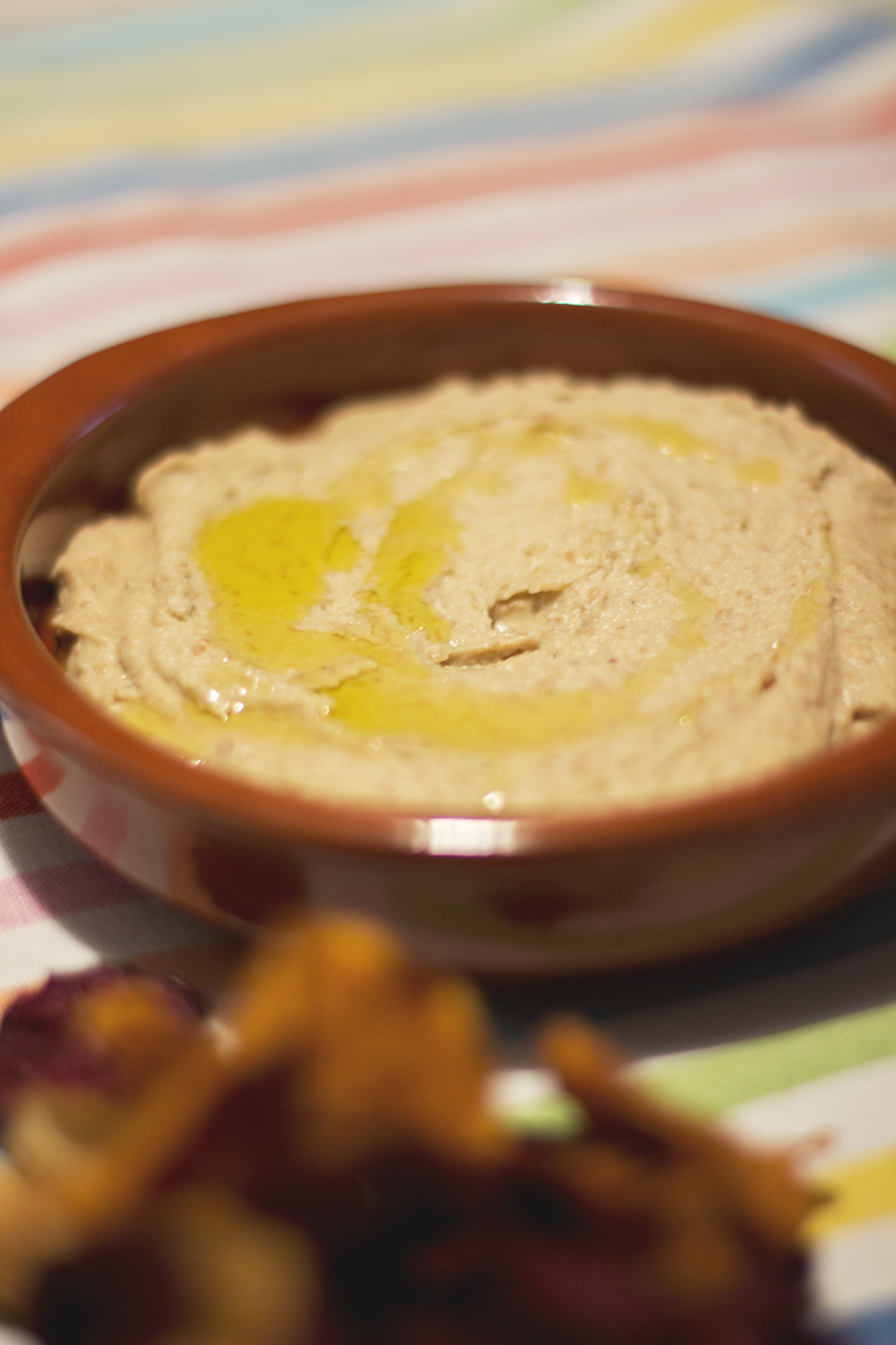 Serviremos el hummus con verduras cortadas a tiras (crudités): zanahoria, apio, pepino... tostaditas o chips vegetales.