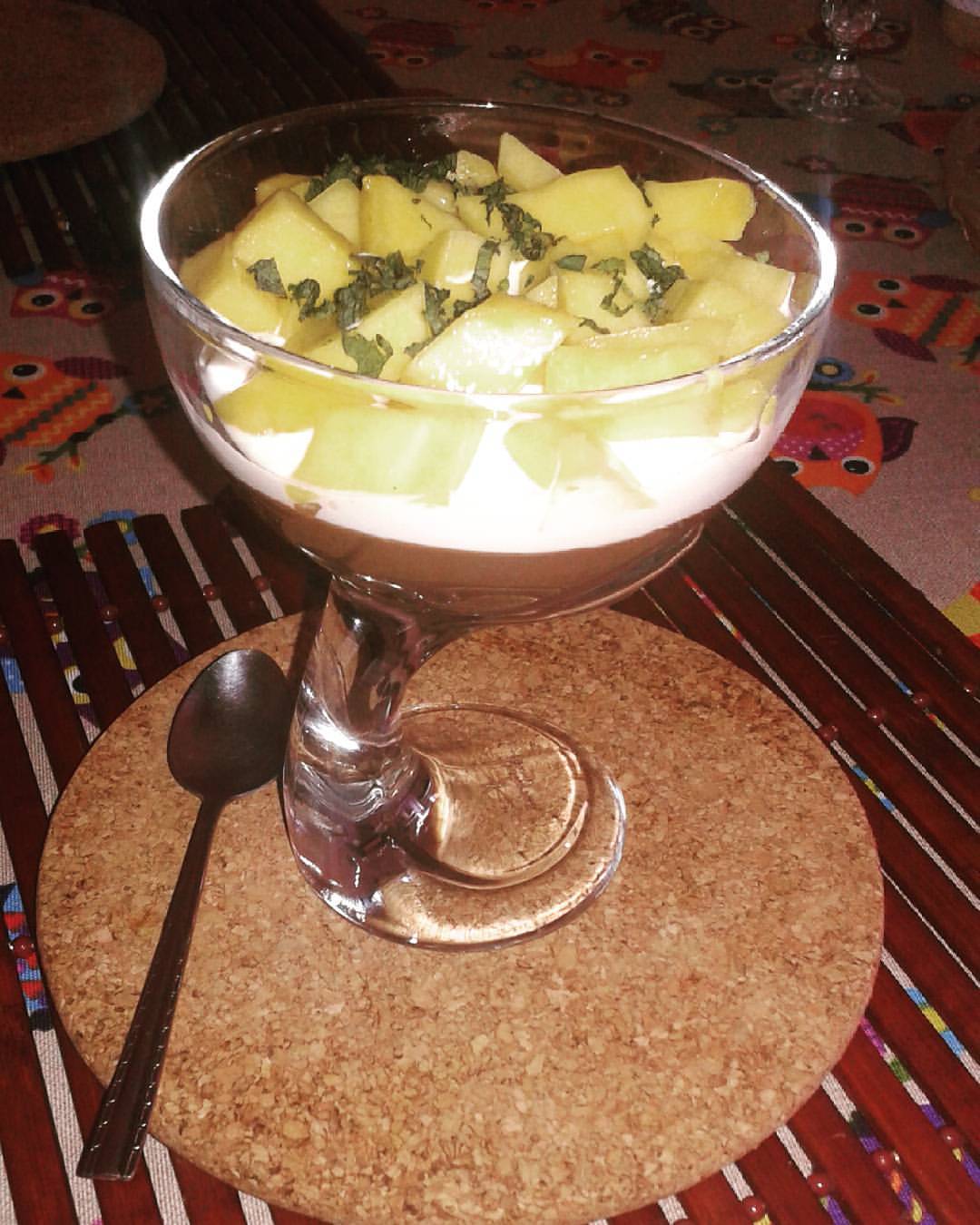 Antes de servir , añadimos el yogur, en cada copa y repartimos el mango troceado como se aprecia en la imagen, añadiendo un poco de hojas de hierbabuena picada que le aportará un toque de frescor.