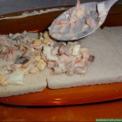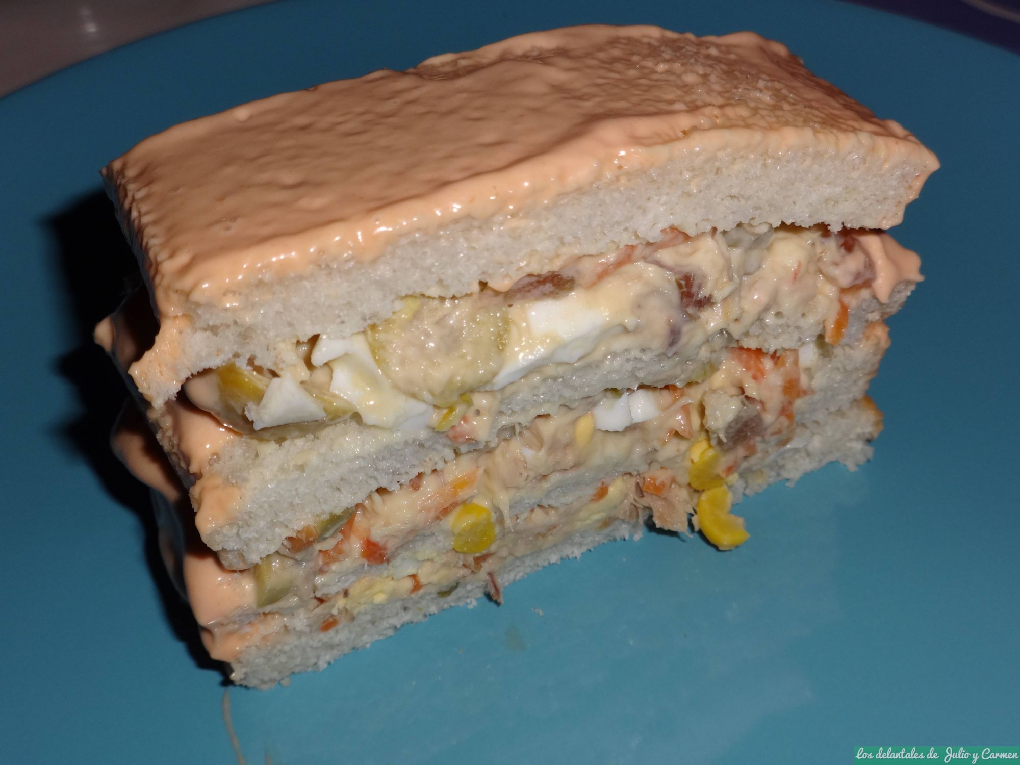 En una fuente, pondremos tres rebanadas de pan y esparciremos por encima la mezcla del resto de ingredientes. Pondremos otra capa de pan y repetiremos al proceso, hasta completar tres capas, acabando con una capa de pan de molde.