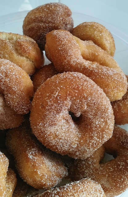 Lavar el limón y rallar, en un bol batir los huevos, incorporar la leche de soja, el azúcar, la levadura, el aceite y mezclar todo bien, ir echando harina poco a poco hasta que la masa se pueda manipular, que no este muy pegajosa. A continuación hacer las rosquillas y freír en aceite muy caliente, hasta que estén doradas, escurrir en un papel de cocina y rebozar en azúcar y canela.