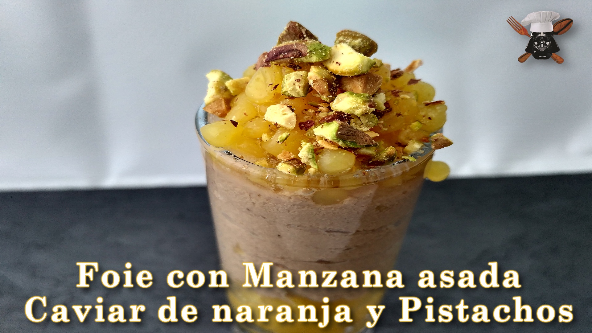 Asi que ahora solo nos falta el montaje del plato. En un vaso de chupito, para eventos o Navidad hay vasos de chupito de degustación que son mas pequeños, se coloca en la base de estos un poco de manzana asada,luego incorporamos 3/4 partes de Mousse de Foie y para dar el toque elegante la ponemos la naranja (en la versión que tengan) y espolvoreamos trozos de pistachos por encima. Es un entrante navideño de lujo al alcance de todos vosotros.