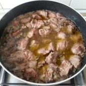 Una vez sofrita toda la carrillada añadimos todos los ingredientes, bajamos el fuego, la tapamos y la dejamos a fuego lento, espumando bien al principio, hasta que esté tierna y la cebolla se haya deshecho hasta desaparecer.