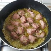 Una vez esté la cebolla dorada, añadimos la carrillada hasta que cubra el fondo y la sofreímos bien por ambos lados. Lo iremos haciendo en varias tandas hasta que tengamos toda la carne lista. Si hubiera mucha carne y tuviéramos que hacer varias tandas puede ser preferible hacer primero la carne y luego la cebolla para evitar que ésta se queme.