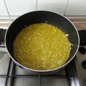 Ponemos el aceite en la cacerola y calentamos a fuego medio; cuando esté caliente añadimos la cebolla, que pocharemos hasta que empiece a dorarse.