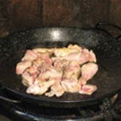 Una vez el aceite esté caliente comienzas a freir la carne a fuego lento. La carne de pollo y de conejo se tiene que freir hasta que coja un color dorado bonito. Cuando la carne coja este color dorado sabremos que está en su punto.