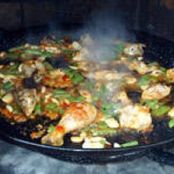 Primero se limpia la verdura. Si se usan alubias y judías congeladas, se espera a que se descongelen. Usando éstos ingredientes congelados te ahorras tener que limpiar y cortarlos. A continuación se corta el ajo en rodajas y la cebolla en cubos. Después se limpia la carne de pollo y de conejo. Ambas carnes se cortan en trozos uniformes. Antes de freír los ingredientes se pone la paella (sartén) al fuego con un poco de aceite de oliva virgen y se deja calentar el aceite.