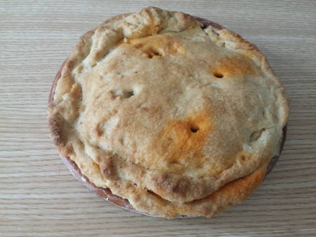 Con el otro tercio de la masa, confeccionamos una tapa circular con la que cubrimos el molde, la unimos muy bien en los bordes al resto de la masa y la perforamos con cuatro agujeros que haremos con un palillo.