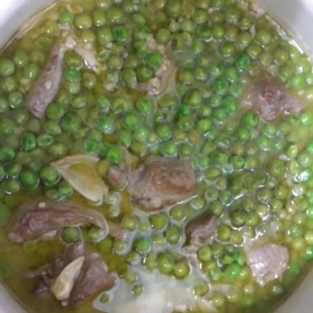 Añadimos 500 gramos de guisantes frescos o ya descongelados y dejamos cocer a fuego lento unos 10 minutos hasta que estén en su punto.