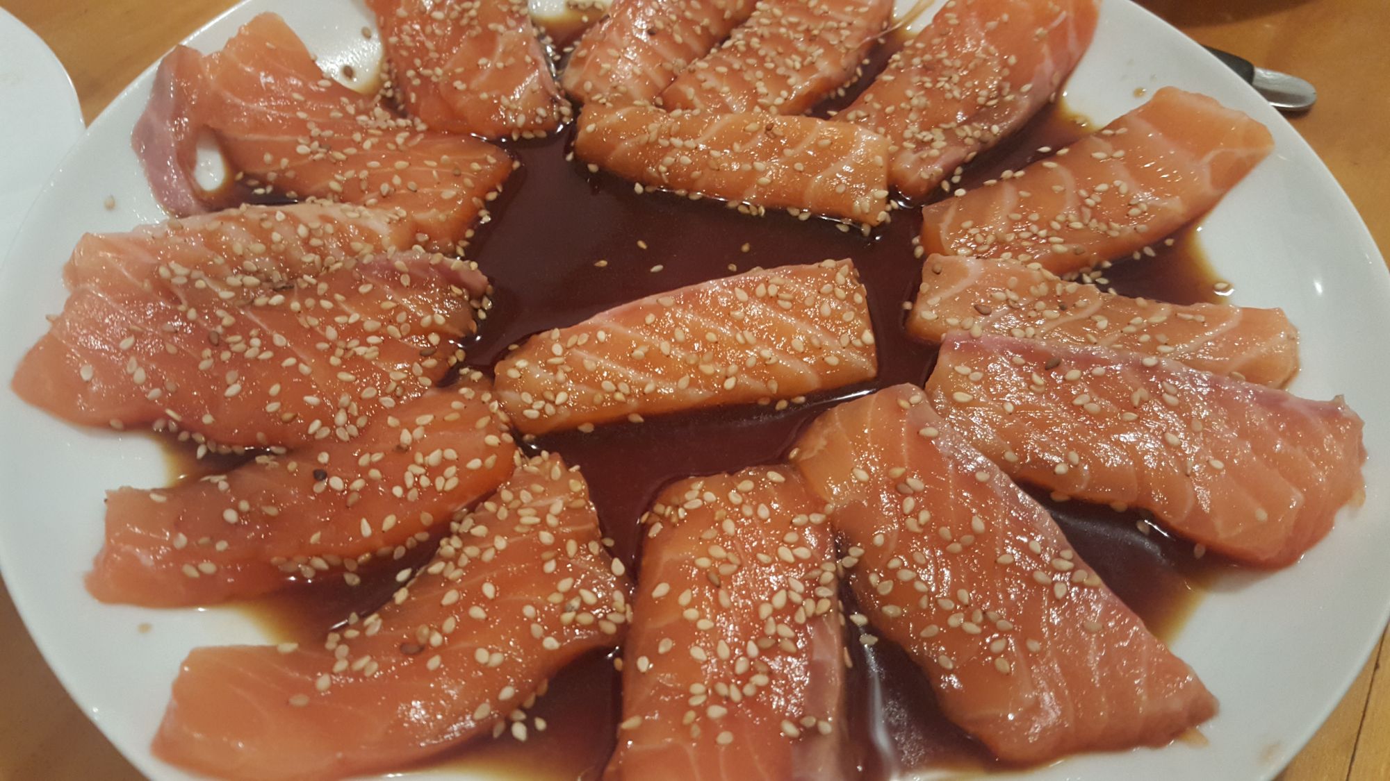 En crudo cortamos láminas de salmón de medio dedo o al gusto, un un plato poremos un poco de soja, colocamos los trozos de salmón y los cubrimos con un poco de sésamo. Listo para comer.