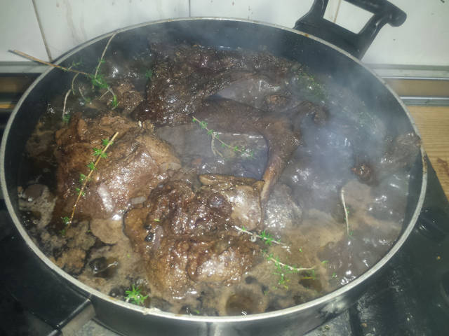 Añadimos la carne de liebre, el adobo y el resto de los ingredientes y la cocinamos a fuego lento hasta que esté tierna (unas 2 horas, si la liebre es grande).