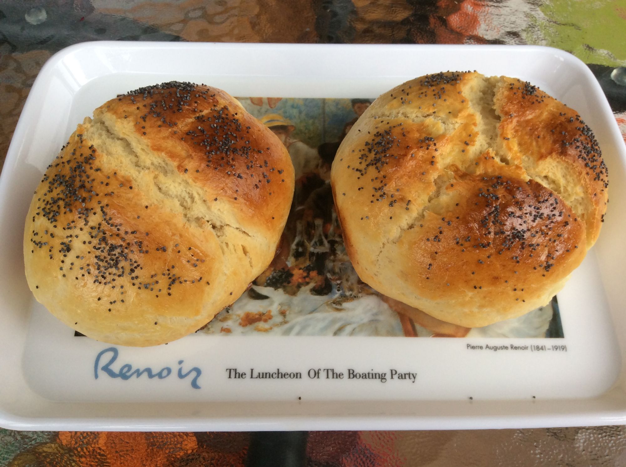 Yo he preparado esta vez 2 panecillos y con la otra mitad de masa un solo pan en forma de trenza.